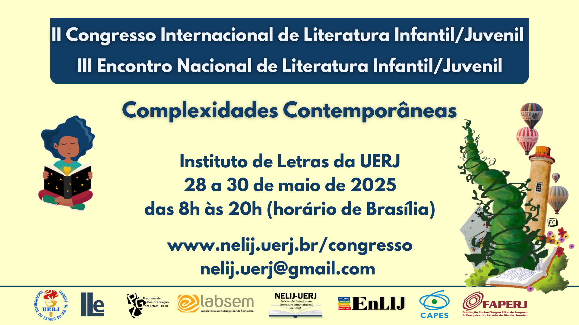 O congresso foi uma ação do Grupo de Pesquisa-CNPq Encontros com a Literatura Infantil/Juvenil: ficção, teorias e práticas (EnLIJ), do Núcleo de Estudos em Literatura Infantojuvenil da UERJ (NELIJ-UERJ), do Seminário Permanente de Estudos Literários da UERJ (SePEL-UERJ) e da Unidade de Desenvolvimento Tecnológico Laboratório Multidisciplinar de Semiótica (UDT LABSEM), com apoio dos GTs da ANPOLL Leitura e Literatura Infantil e Juvenil e Vertentes do Insólito Ficcional, do Programa de Pós-graduação em Letras da UERJ e do Instituto de Letras da UERJ.